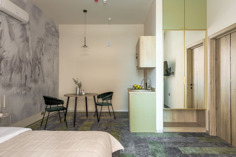 Номер-это мини оазис с большой двуспальной кроватью, кондиционером и мини-кухней для самостоятельного приготовления чая.