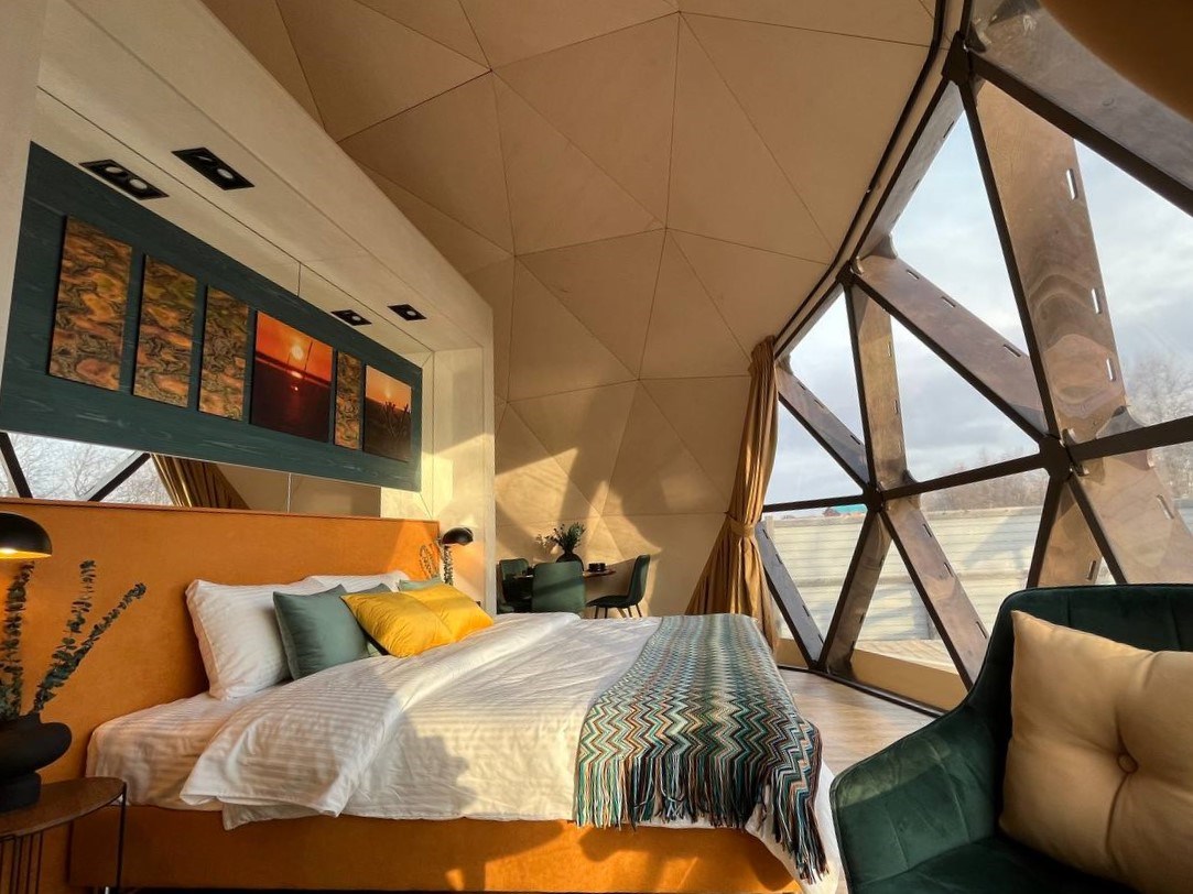 Внутреннее пространство купола "Геоточка" позволяет перемещаться внутри по кругу с собственной деревянной террасой на каждом сегменте.
