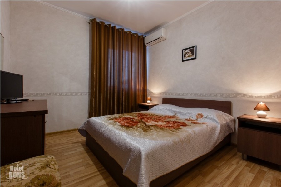 В каждом номере двуспальная кровать, две прикроватные тумбочки и два ночные светильника.