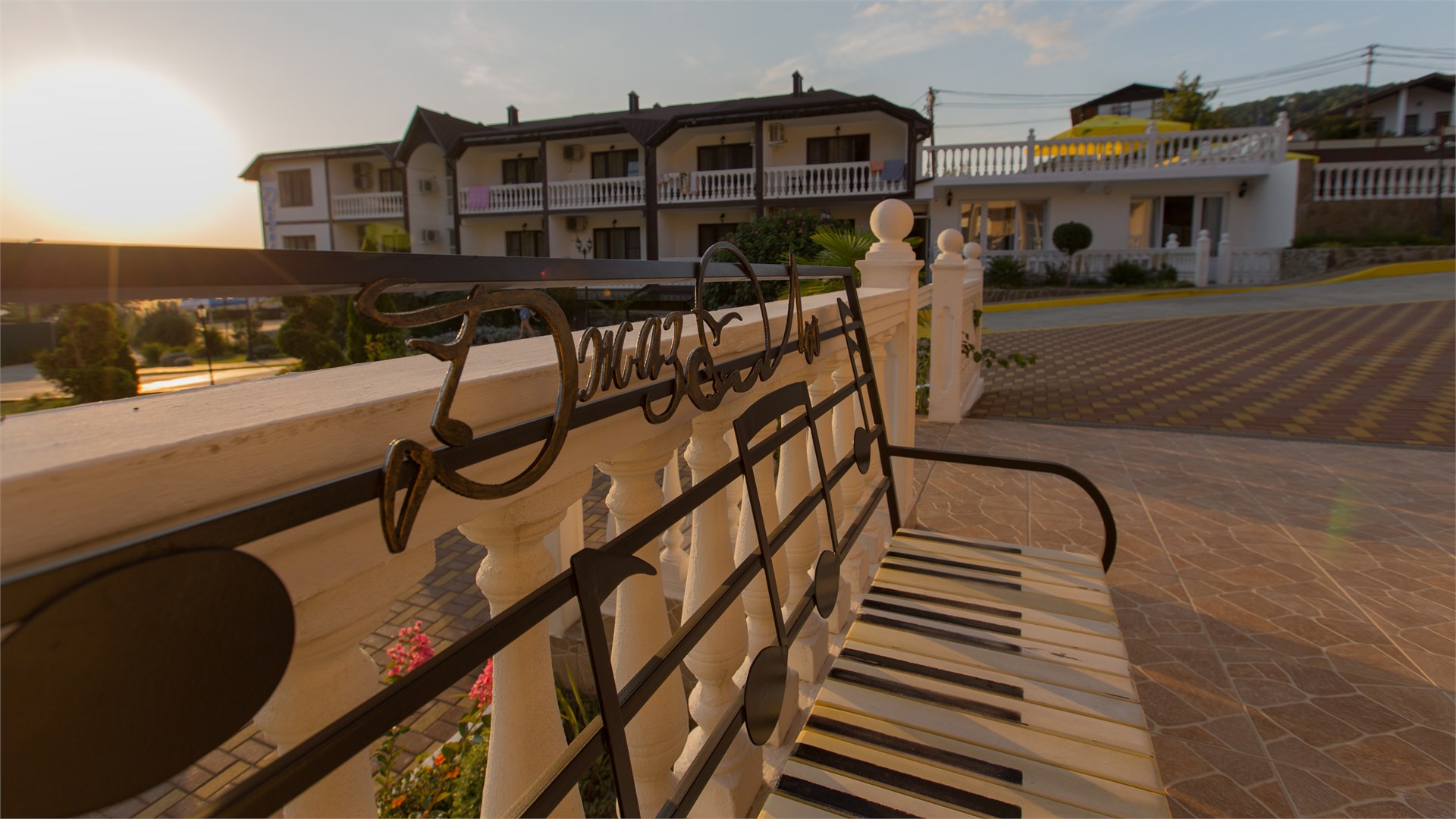 Уютный отель в Лоо с балконами с морским видом на закат.