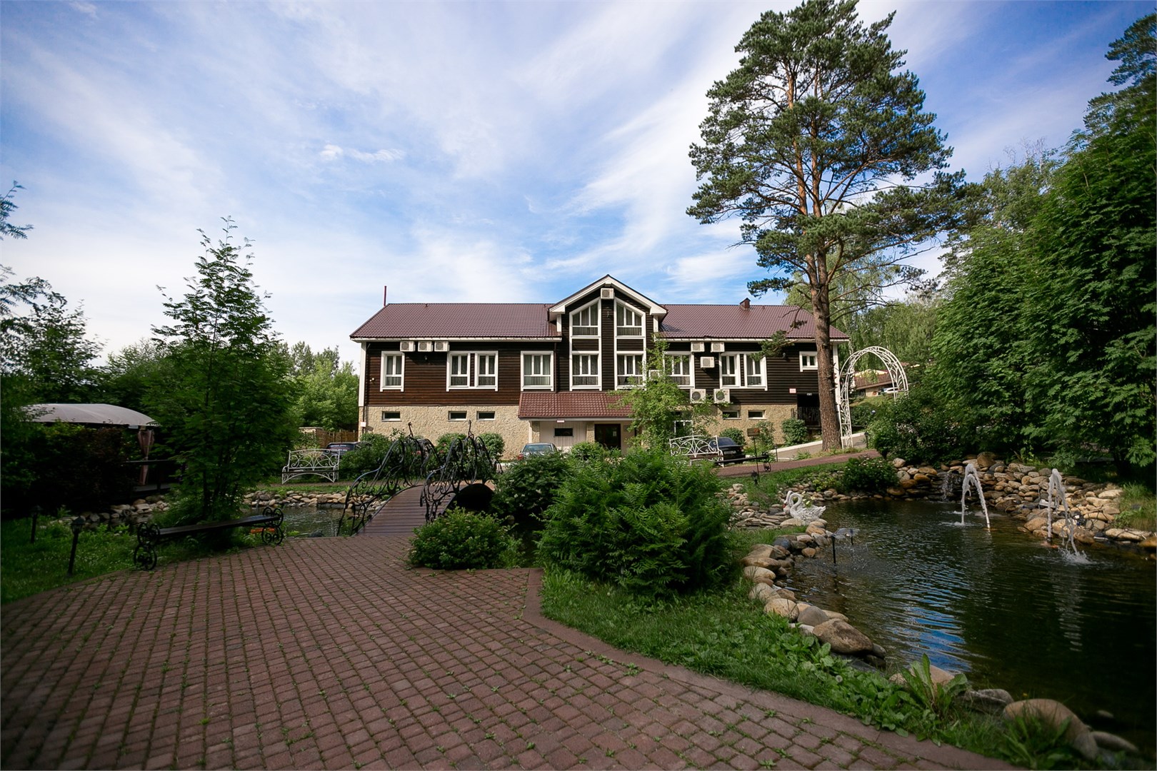 Загородный дом «Усадьба Жемчужная» с рестораном, общим лаунджем, садом и открытым бассейном расположен в 27 км от стадиона «Олимпийский».