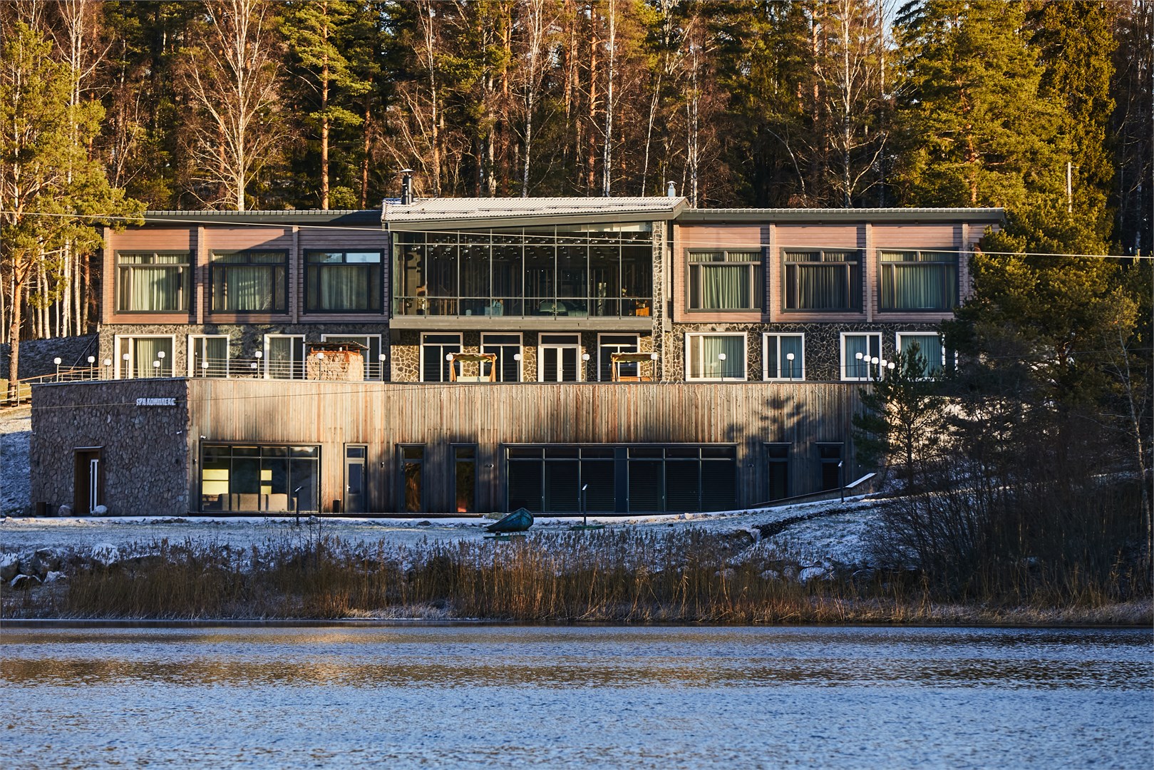 Современный Дом для отдыха комфорт класса с дизайнерским подходом и панорамным видом на лес, находится на возвышенности в окружении сосен, что создаёт